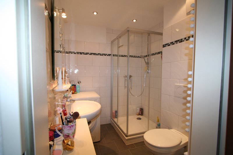 Das Badezimmer ist neuwertig und beinhaltet eine Wand- und Bodenverfliesung, eine Duschwanne, Waschtisch- und WC-Anlage.